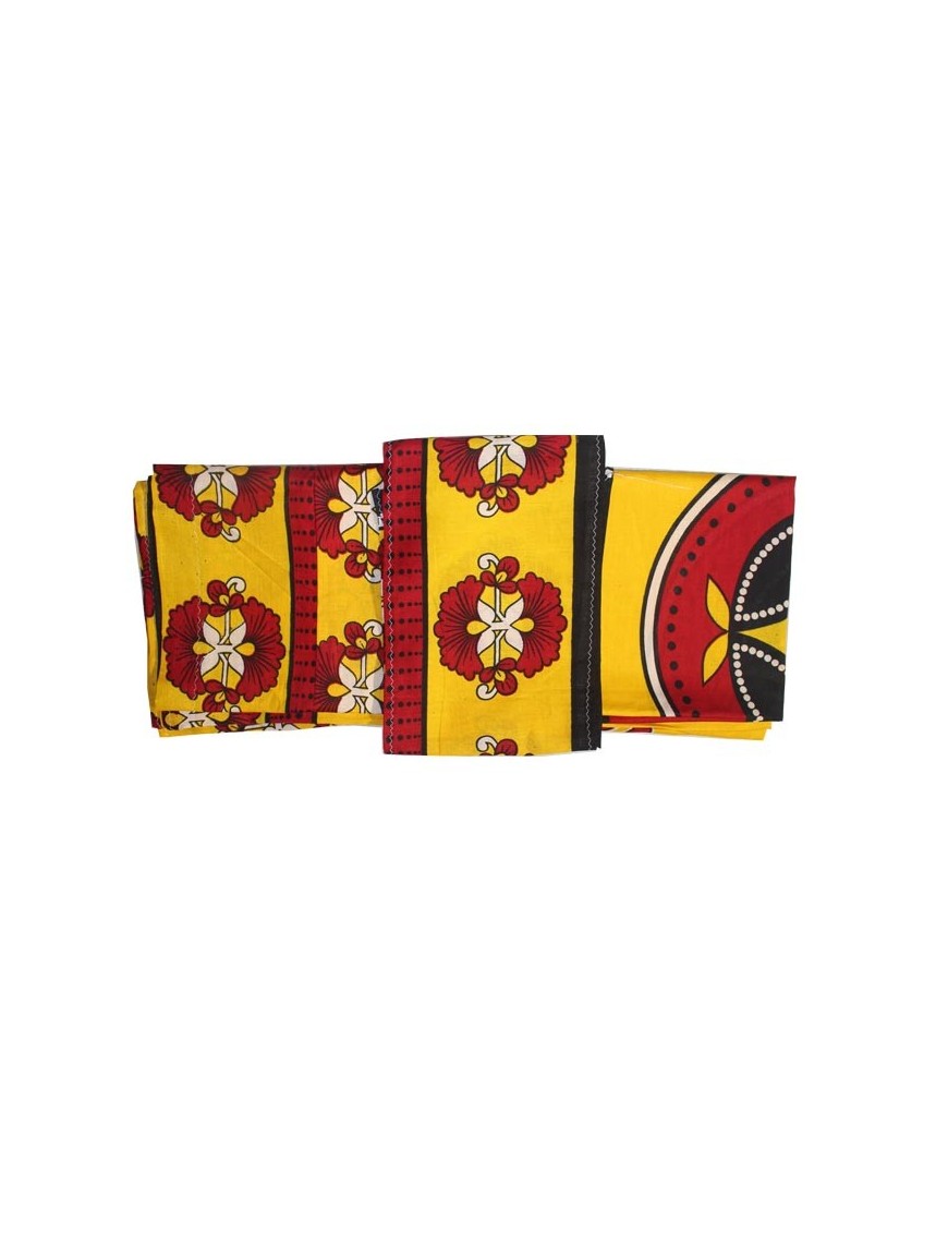SALOUVA en 100% coton de couleurs jaune et rouge, fabriqué et imprimé à Tanzanie, comprend 2 morceaux de tissus cousus : Salouva et un foulard.